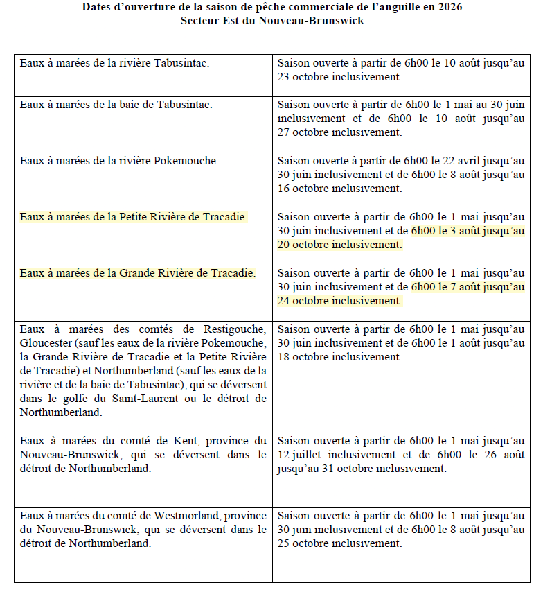 avril 16, 2026 Communications UPM Pêche commerciale de l’anguille – Est du N.-B. avril 16, 2026 Communications UPM Les mesures de gestion de 2025 sont maintenues pour 2026.Voici les dates d’ouverture, avec les changements en jaune. Communications UPM