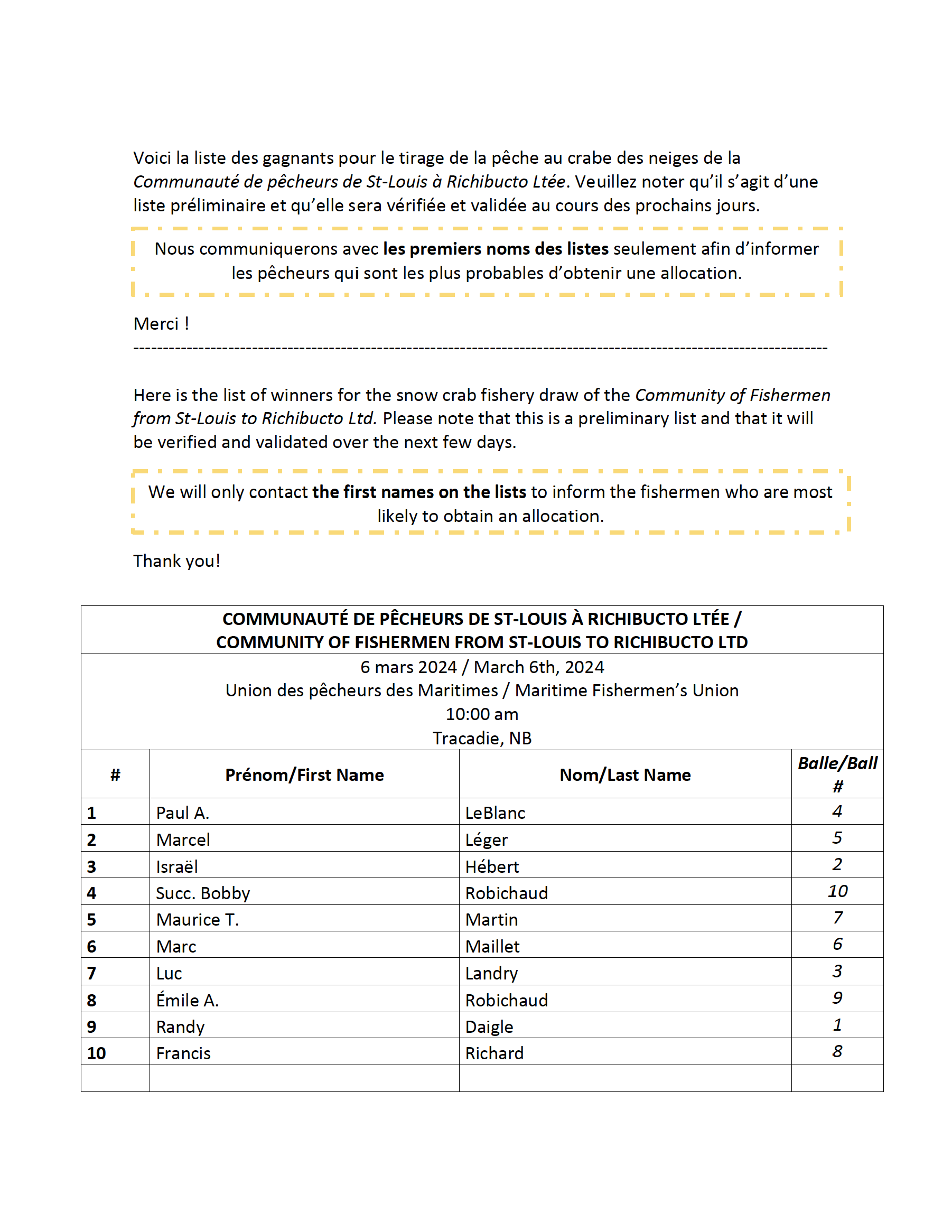 mars 6, 2024 Communications UPM 25B RÉSULTATS TIRAGE PÊCHE COMMUNAUTAIRE AU CRABE DES NEIGES mars 6, 2024 Communications UPM Communications UPM